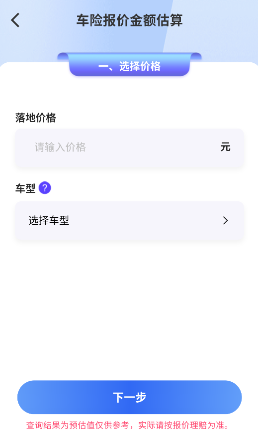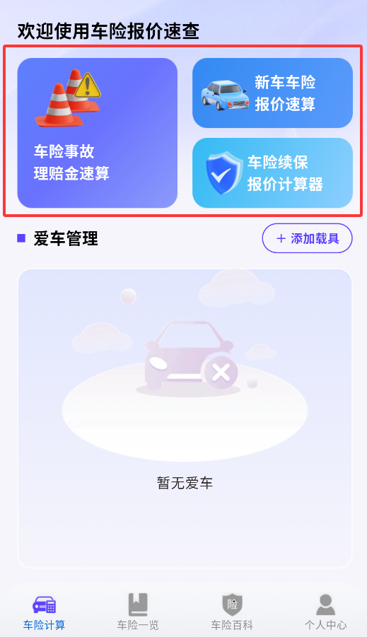 1、启动APP后,进入“车险计算”专区,选择对应服务(新车/续保/理赔估算)。