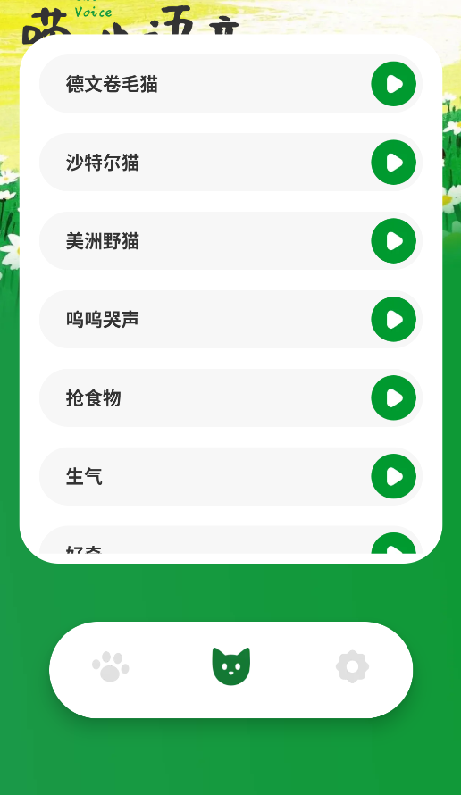2、进入"猫语模拟"功能,可选择撒娇、警告等不同情绪的猫叫声效,还能模拟抢食等互动场景音效。