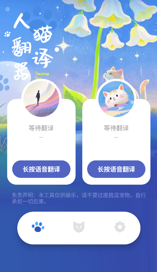 2、双向翻译系统:支持人声转猫语和猫语转人声双向翻译。内置100+种猫咪交流常用词汇库,覆盖日常互动场景。