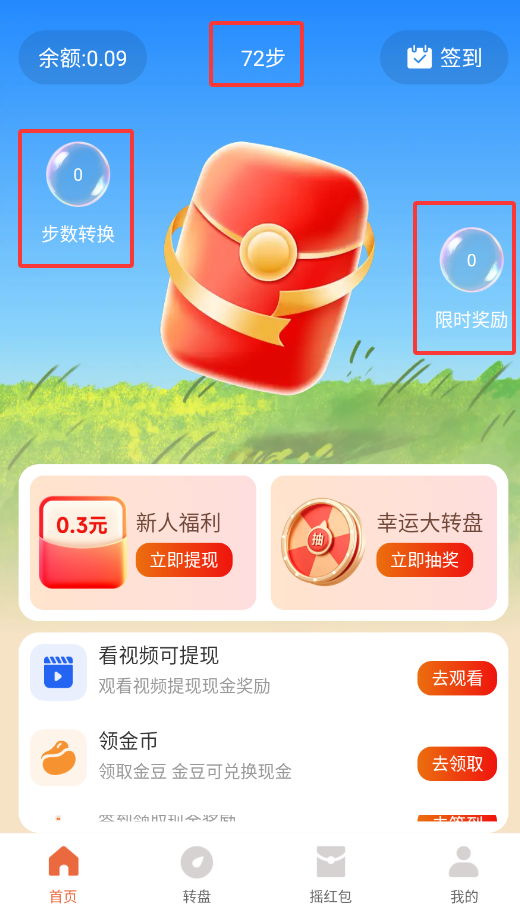 1、启动走路赚钱多APP后,在首页点击"签到"按钮即可领取每日步数奖励。