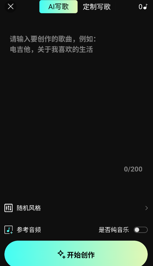 2、可选择两种创作模式:AI智能生成(输入关键词自动谱曲)或手动定制(自由编排旋律和和弦)。