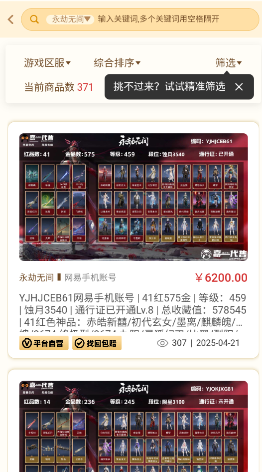 2、覆盖300+热门游戏,包含主流手游和端游。智能分类系统支持按游戏类型、区服等精准筛选。
