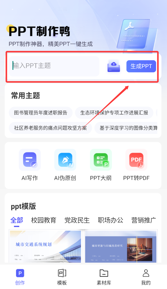 PPT制作鸭助力用户轻松打造专业演示文稿,内置智能工具可快速生成初稿,仅需输入主题即可获取灵感推荐。海量精致模板与素材库支持自由搭配,智能排版功能让内容呈现更美观。支持多格式导出,方便在不同场景下播放与分享,提升工作效率。操作流畅,适合各类办公需求。