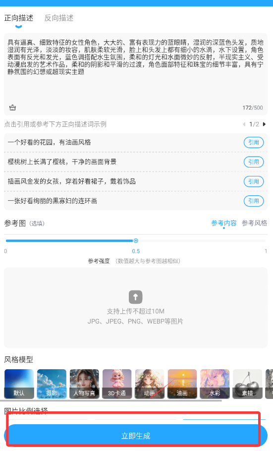 1、采用先进算法实现图生图转换功能,用户上传参考图片后系统会自动匹配风格并生成新作品,简化创作流程。