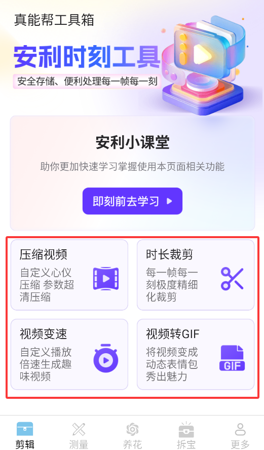 真能帮工具箱这个工具箱APP挺全能的,视频剪辑、测量工具都有。剪视频能调速能裁剪,量角度测分贝也不在话下。还能记录养花过程,功能多但不杂。平时要用小工具的,装一个挺省事。操作简单,用着顺手,快点去下载一个试试吧,不会让你感觉后悔的。