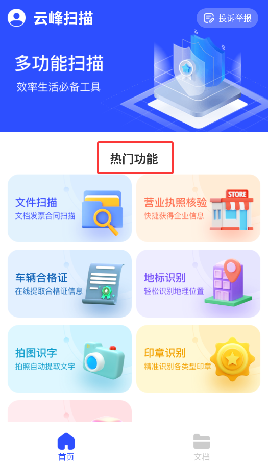 1、打开APP后,首页提供多种智能扫描功能,包括文件数字化、营业执照验证、图片文字提取及地点标识识别等实用工具。