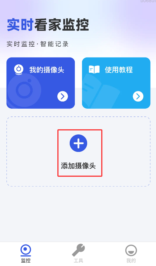 1、启动监控实时看家APP后,点击首页"添加设备"按钮进入摄像头配置界面。