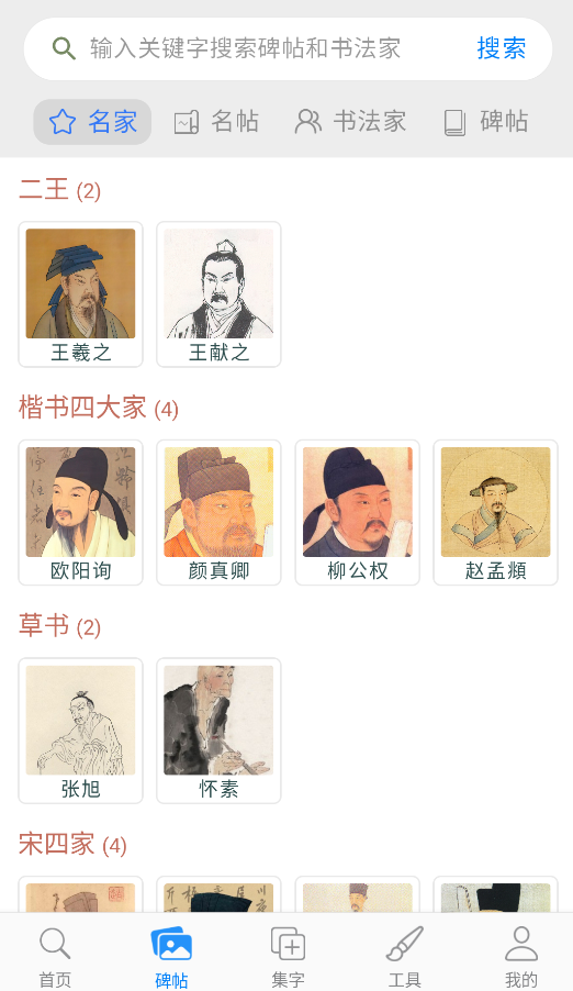 1、打开应用后,在首页直接搜索特定汉字的书法写法,或者通过"书法名家"入口浏览不同书法家的经典作品。