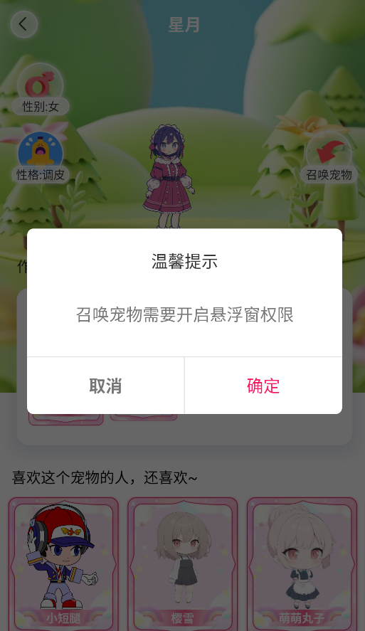 3、根据提示授权悬浮窗权限,即可在手机桌面生成动态宠物窗口,实时投喂、玩耍。