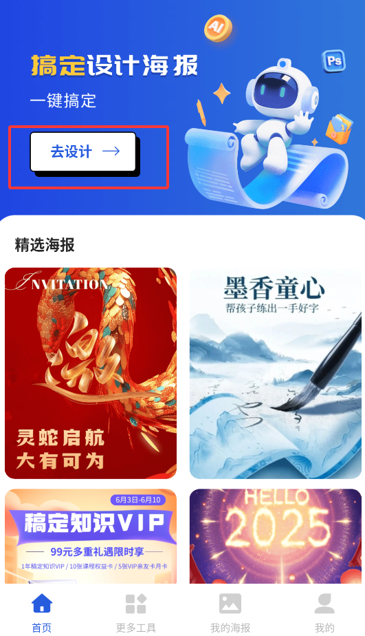 1、启动AI搞定设计APP,点击首页"开始设计"按钮进入海报创作界面。
