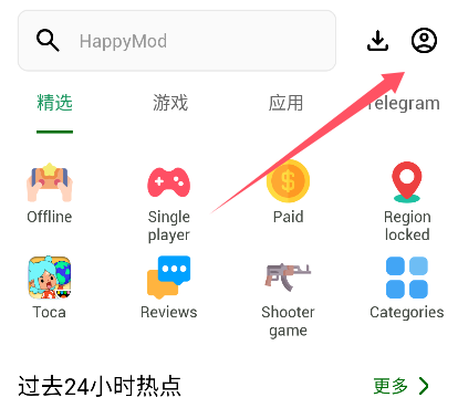 1、happy mod是自带中文语言的,用户只需要下载最新客户端,然后登录软件点击右上角的用户图标。
