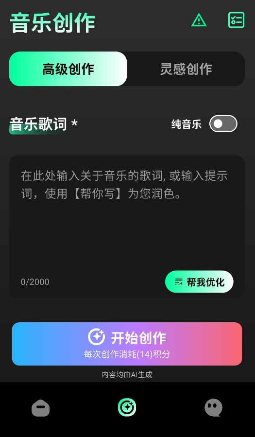 2、进入创作中心可选择"专业模式"精细调整乐曲参数,或使用"灵感模式"通过关键词自动生成旋律。