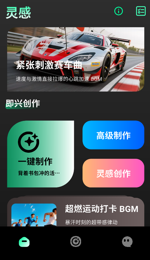 1、打开APP后,首页提供多种创作模式,包括智能一键生成、专业编曲和灵感激发等音乐制作功能。