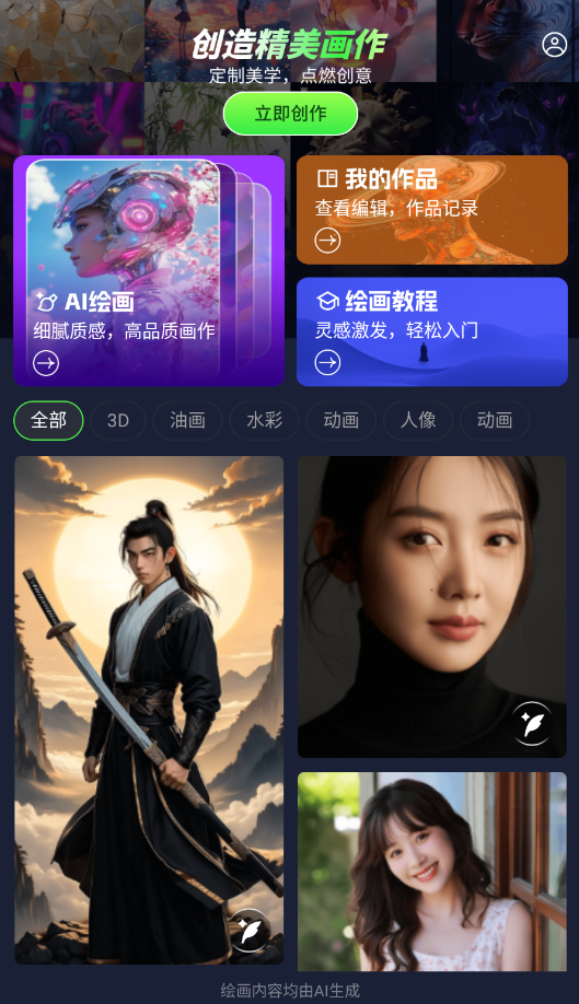 3、掌握基础后进入AI创作界面,选择风景、人物等绘画类型开始生成作品。