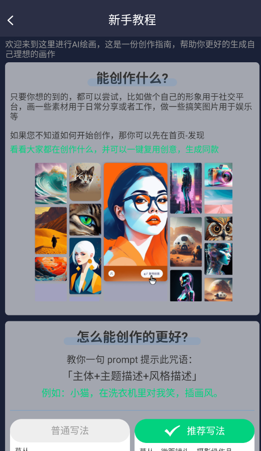 2、系统提供的创作指南会详细讲解关键词设置、风格选择等核心功能使用方法。