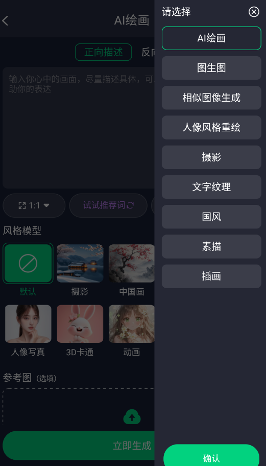 1、启动应用后选择创作模式,通过文字描述或图片上传表达创作意图,系统会实时生成预览效果。