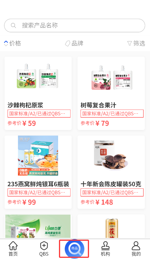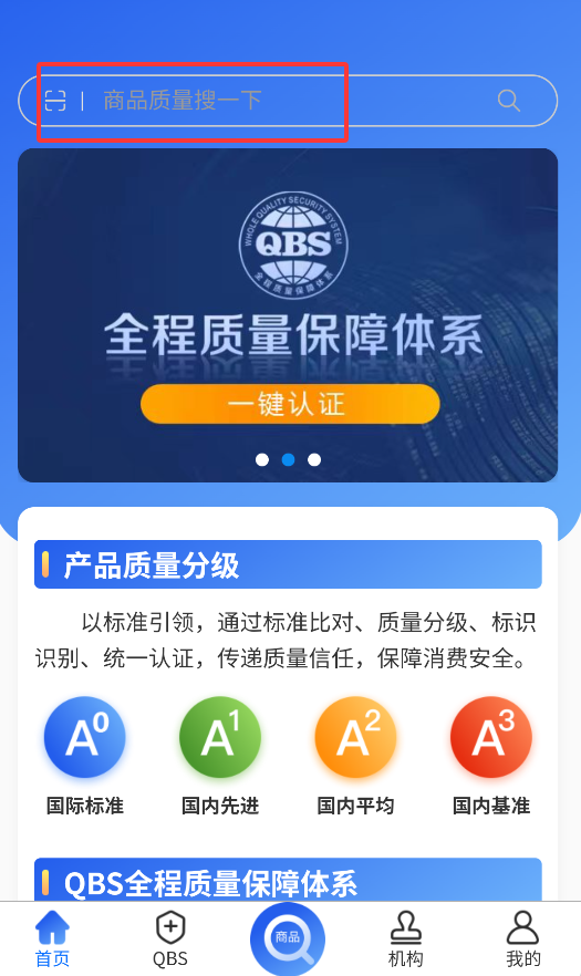 1、启动APP后,在首页搜索框输入商品名称,即可查询该产品的质量认证、检测报告等详细信息。