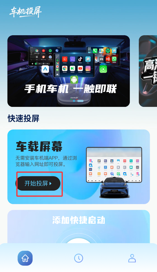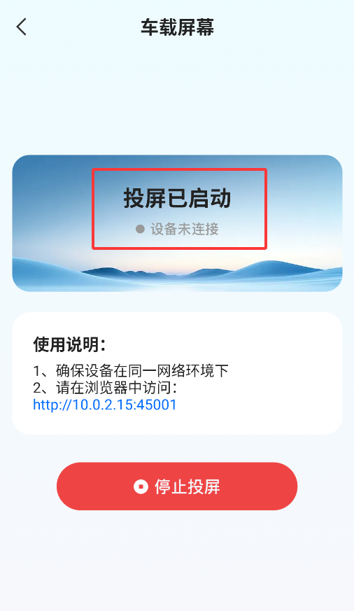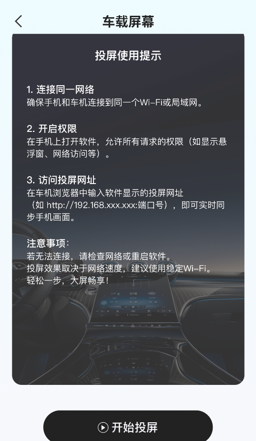 2、确保车载屏幕处于接收模式,仔细阅读操作指引后点击"立即投屏"开始连接。