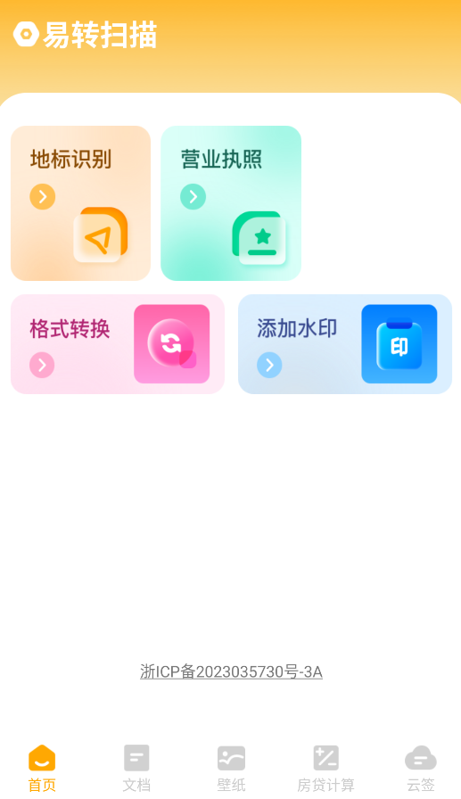 1、打开应用后,在首页选择扫描功能,支持证件识别、文件格式转换及水印添加等实用操作。
