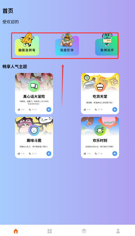 1、进入首页,可以按照选项选择喜欢的游戏,点击进入即可。
