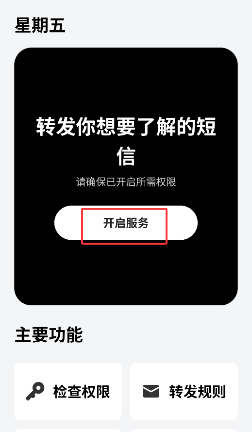 1、启动墨囊短信转发APP后,点击首页"开启服务"按钮激活短信监控权限。
