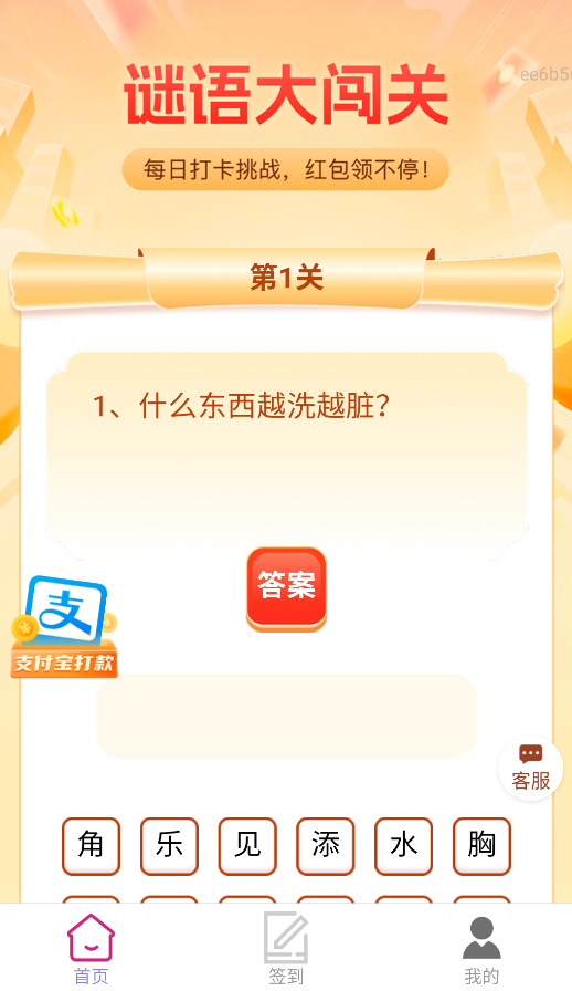 1、打开APP后,首页提供趣味谜语闯关游戏,答对题目即可获得随机红包奖励,挑战越多奖励越丰厚。