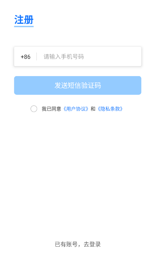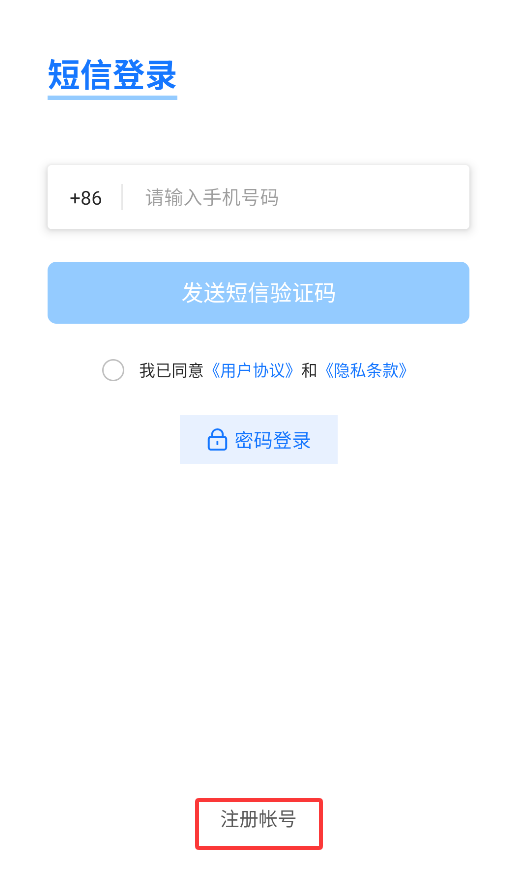 1、启动APP后,在登录页面点击“注册账号”按钮,进入账号创建界面。