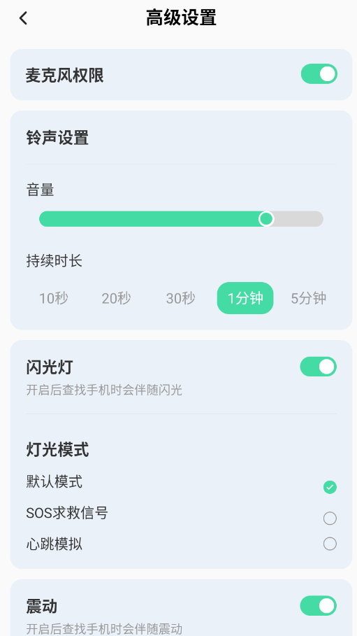 3、进入高级选项可调节音量大小、震动模式等个性化寻机提醒效果。