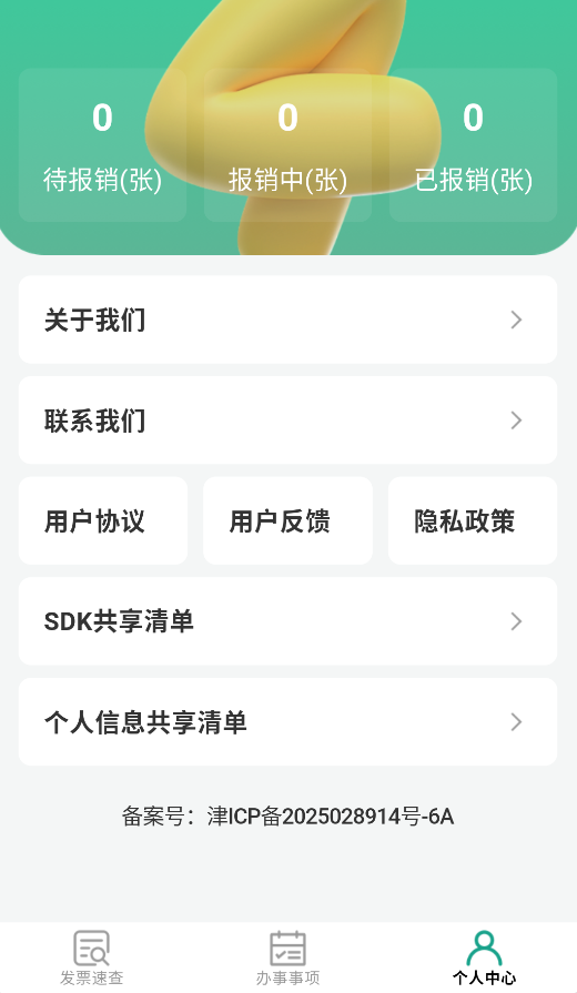3、个人中心清晰展示发票处理全流程数据,包括待提交(X张)、审核中(X张)和已报销(X张)的实时统计,附带累计报销金额。