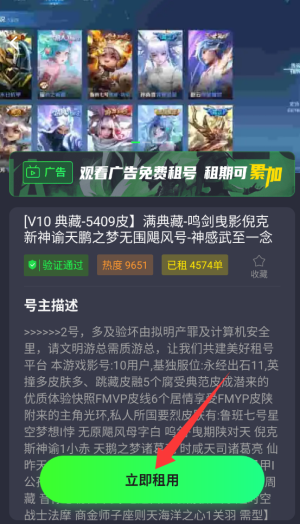 3、浏览账号信息后点击"租号"按钮,确认租赁时长并完成支付即可。