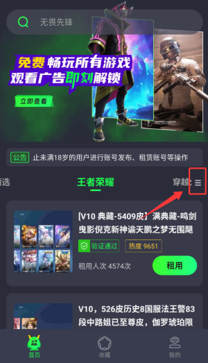 1、启动免费租号玩APP后,点击左上角菜单图标展开游戏分类列表。