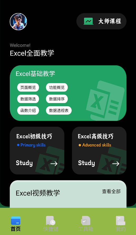 1、打开应用后,首页提供体系化的Excel学习路径,包含「零基础入门」、「函数精讲」到「VBA编程」等阶梯式课程,支持随堂练习。
