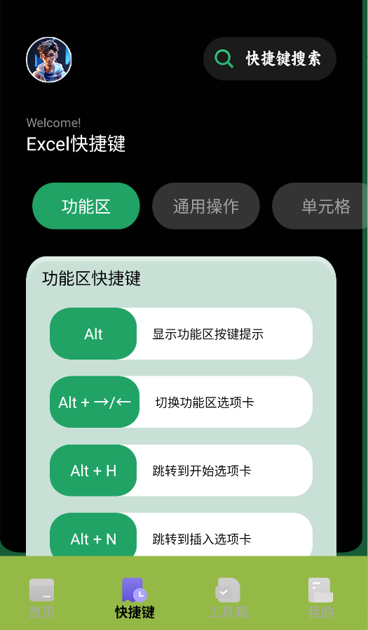 2、快捷键专区收录300+个组合键操作(含Windows/Mac双平台),可按功能分类浏览或直接搜索特定快捷键(如"快速求和")。