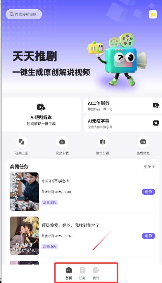 天天推剧是一款专注于短剧创作与推广的实用工具,它通过AI技术大幅降低制作门槛,让用户轻松生成原创短剧解说视频。该平台提供丰富的推广任务和详细教程,支持二次创作,高光片段剪辑等核心功能,帮助用户有效提升作品质量。同时具备智能字幕消除、画质优化等专业编辑工具,使视频内容更加精良。无论是新手还是专业创作者,都能在这里找到适合自己的创作方式,实现内容变现。
