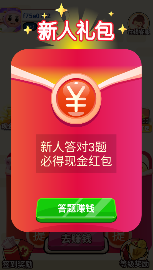 1、启动成语赚钱高手APP后,系统会自动弹出新手礼包,点击"答题"按钮即可参与挑战。