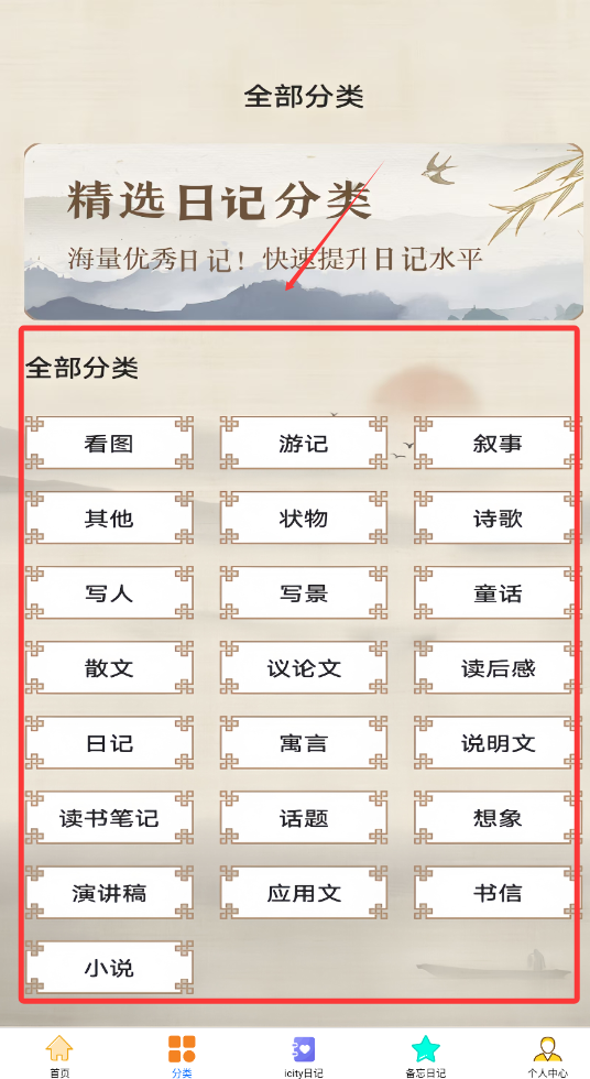 1、多维度分类写作素材库,包含游记,叙事,写人等十余种文体资源,满足不同主题创作需求。