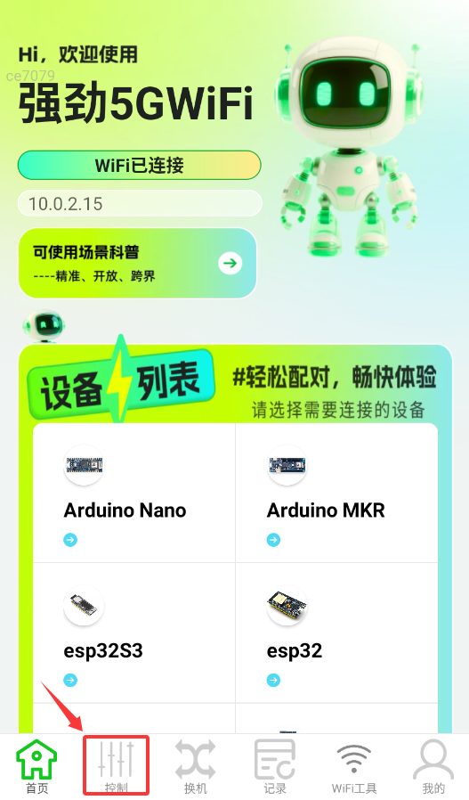 1、启动强劲5GWiFi应用,在底部菜单栏点击"设备控制"选项进入管理页面。