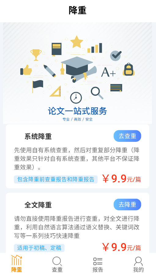 1、打开应用后,在"智能降重"界面可选择两种模式:系统推荐降重(自动改写30%内容)或深度全文降重(结构调整+同义词替换),满足不同需求。