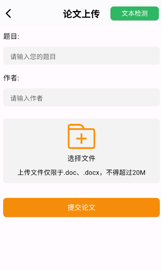 2、操作流程:输入论文标题和作者信息,上传Word/PDF文件(限20M内),系统会在5-10分钟内生成检测报告,标注重复段落及修改建议。