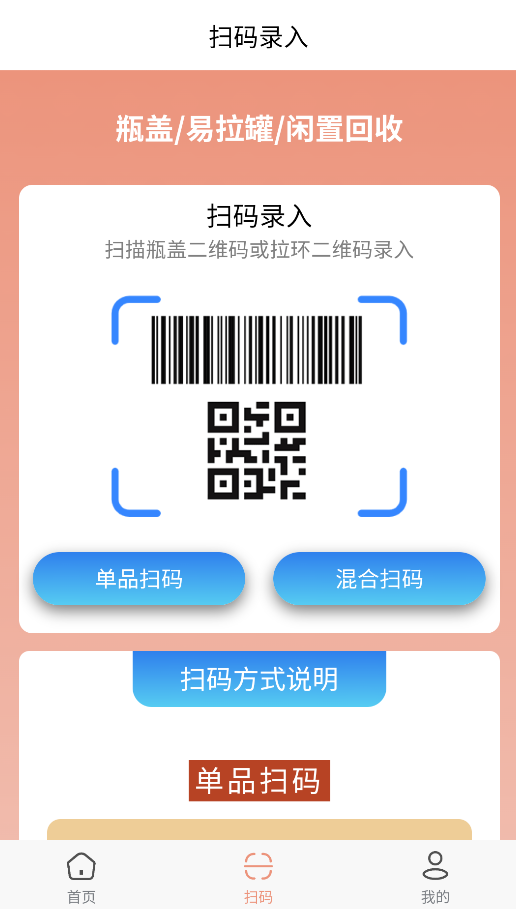 2、进入扫码识别功能,支持对饮料瓶、易拉罐等回收物进行智能扫码分类,也提供混合物品批量扫描模式。