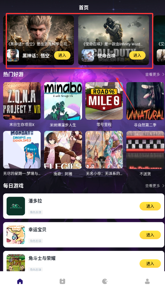 1、进入首页,可以按照选项选择喜欢的游戏,即可开始游戏。