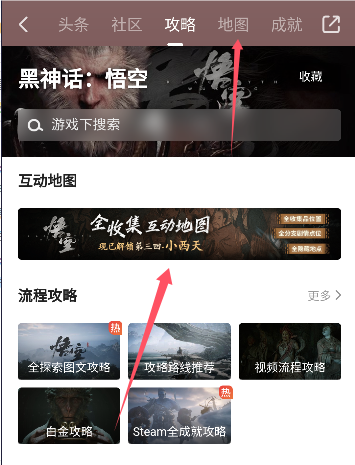 3、进入黑神话悟空攻略专区后,在顶部可以找到【地图】,中间也可以找到【互动地图】。