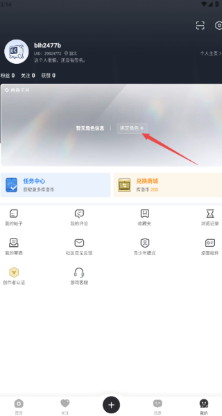 2、在个人详情页中间,有角色展示板块,点击绑定角色;