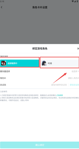 4、然后选择游戏,选择账号和大区信息,选定角色,点击绑定即可展示!