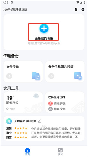 3、生活工具:拥有查天气、查黄历等生活工具,并支持用户快速绑定电脑,实现手机和电脑之间的文件自由传输。