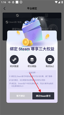 4、弹出绑定steam的三大权益,并点击绑定steam账号。
