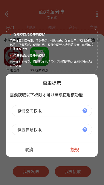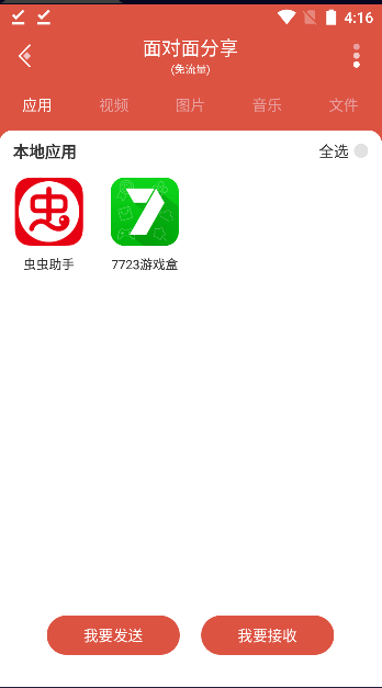 2. 其中包含了【我要发送】,【我要接收】两个选项,如果用户是【我要接收】的话,点击就可以了,如果用户是【我要发送】,那么就需要选择上述app;