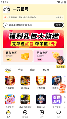 一元租号平台是一个专为各位游戏玩家们设计的游戏租号平台,内有海量的游戏账号供大家选择,覆盖各类热门游戏,并且是只要一元的超低租号价格,采用匿名登录极致,保护用户和号主的信息安全,除了游戏账号以外还有影视会员、加速器的账号哦。