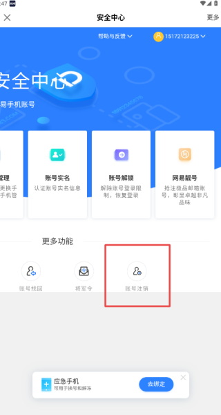 3、进入账号安全中心,往右滑动一下,能够看到注销账号按钮;