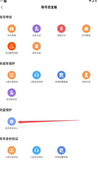 2、进入账号百宝箱,往下拉,找到账号安全中心,点击进入;